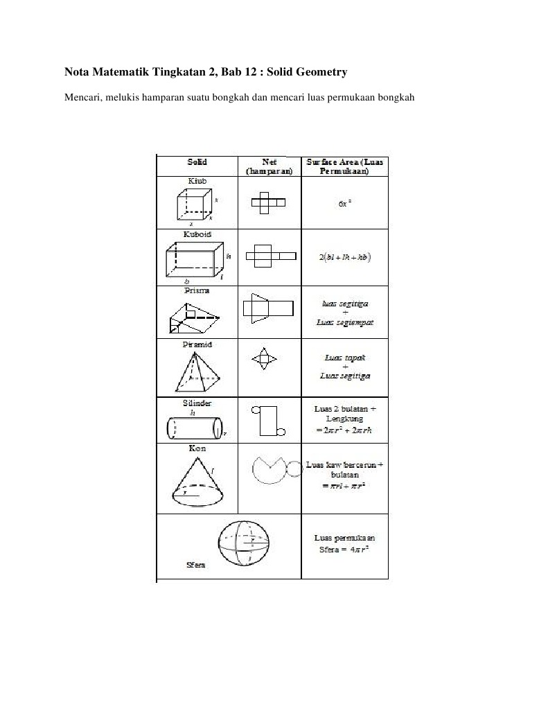 Nota Matematik Tingkatan 2 Bab 12 Solid Geometry Chegu Zam from 3.bp.blogspot.com Bab 1, 2, 3, 4, 5, 6, 7, 8, 9, 10. Solid geometry ii via cheguzam.blogspot.com Apakah itu pi pdf document. Nota matematik tingkatan 2, bab 10 : Meneroka hubungan antara panjang lengkok dan sudut pada pusat bulatan menggunakan perisian geometri dinamik. ( π= 22 7 ) penyelesaian: Kadang² hanya berubah kedudukan sa. ×2 × 7 ×7 = 11 cm 2.