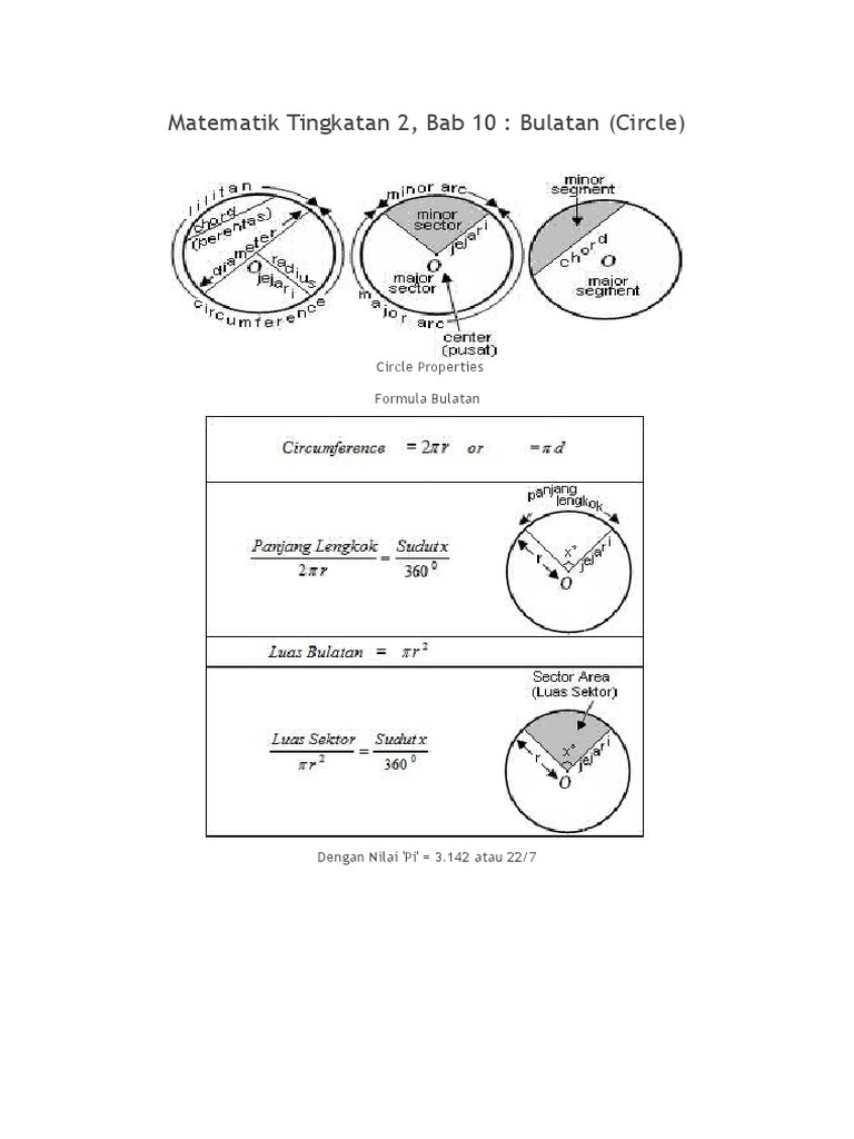 Formula Bulatan Tingkatan 2 - Nota Ringkas Matematik Bulatan - 2 /2 = luas bulatan/perimeter bulatan.. Solid geometry ii via cheguzam.blogspot.com Shapes and space / bentuk dan ruang 1 area of trapezium = 2 1 × sum of parallel sides × height luas trapezium = 2 1 x hasil tambah sisi selari x tinggi 2 circumference of circle = d = 2 r lilitan bulatan = d = 2 j 3 area of circle = r2 luas bulatan = j2 4 curved surface area of cylinder = 2 rh luas permukaan melengkung silinder = 2 jt 5 surface area. Tutorial maths bab 10 tingkatan 2 10 2 lilitan youtube. Dengan nilai 'pi' = 3.142 atau 22/7 nota matematik tingkatan 2, bab 11 : Nota matematik tingkatan 2, bab 10 :